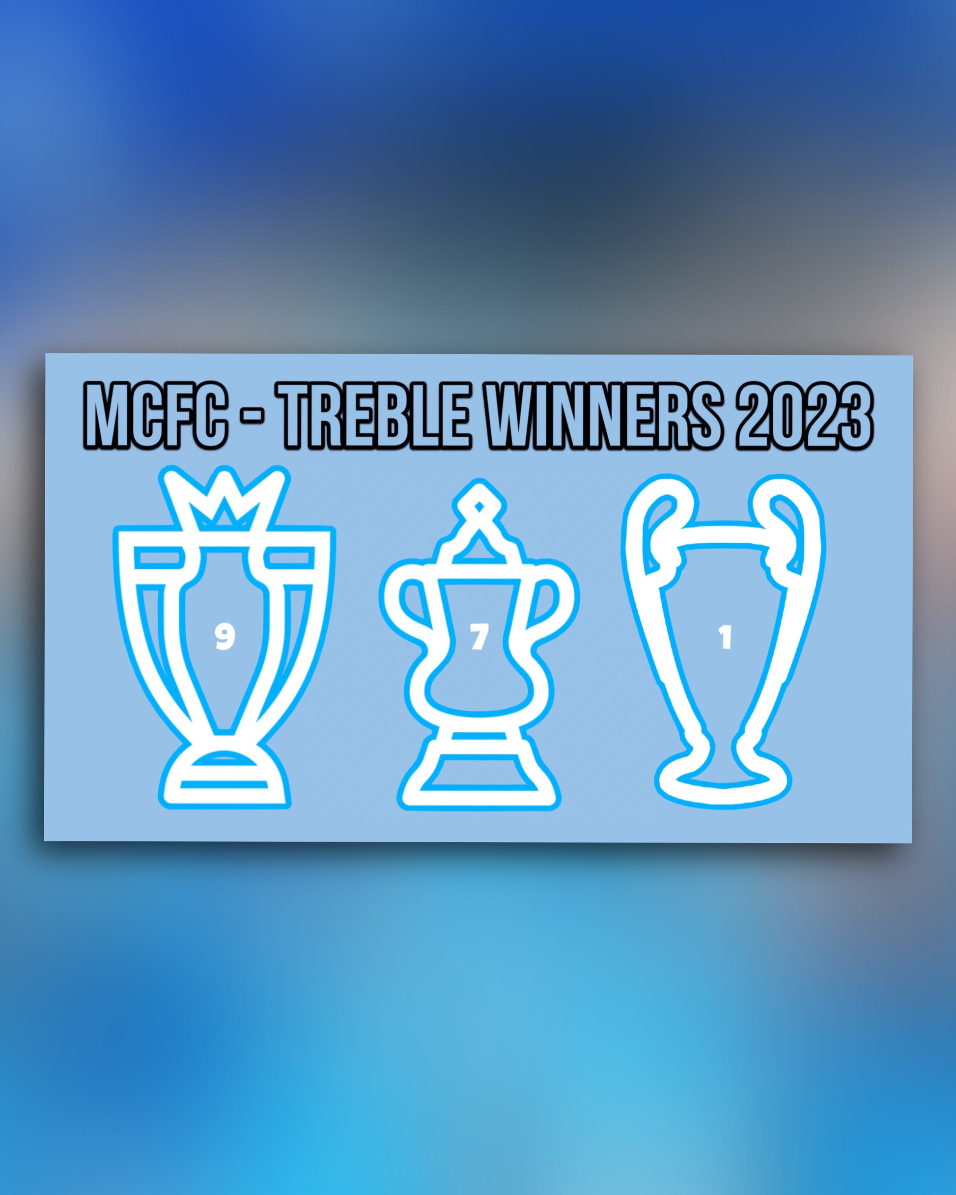 Remind everyone that Manchester City won the Treble with 100 commemorative treble winners stickers.